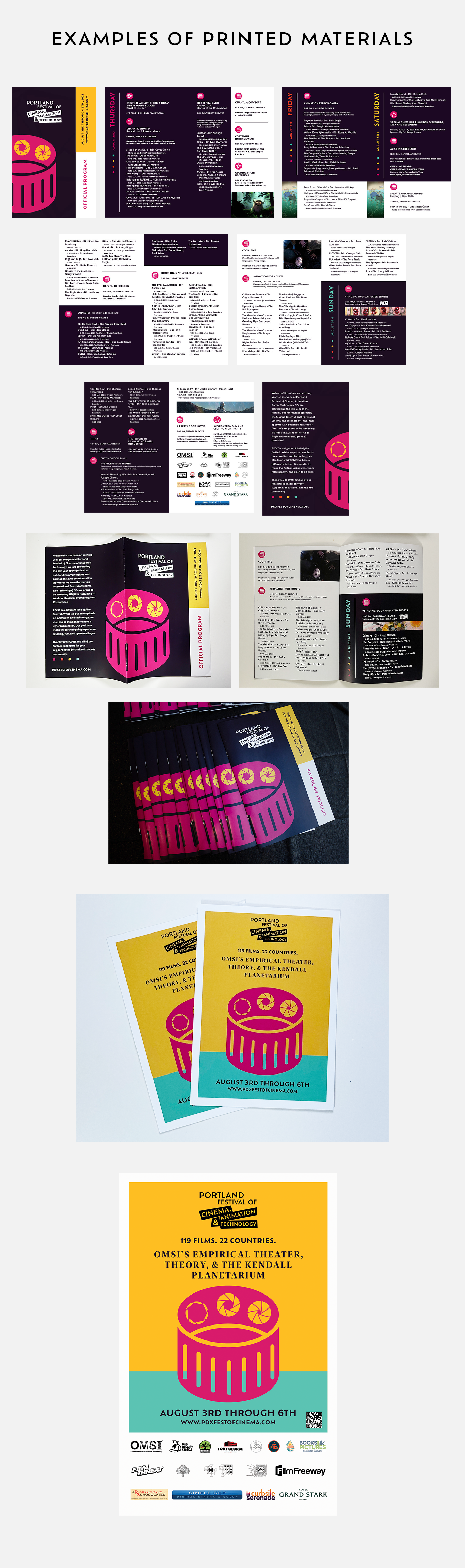 In this project, I created the marketing materials, from web to print, including their logo, for the 2023 "Portland Festival of Cinema, Animation and technology".