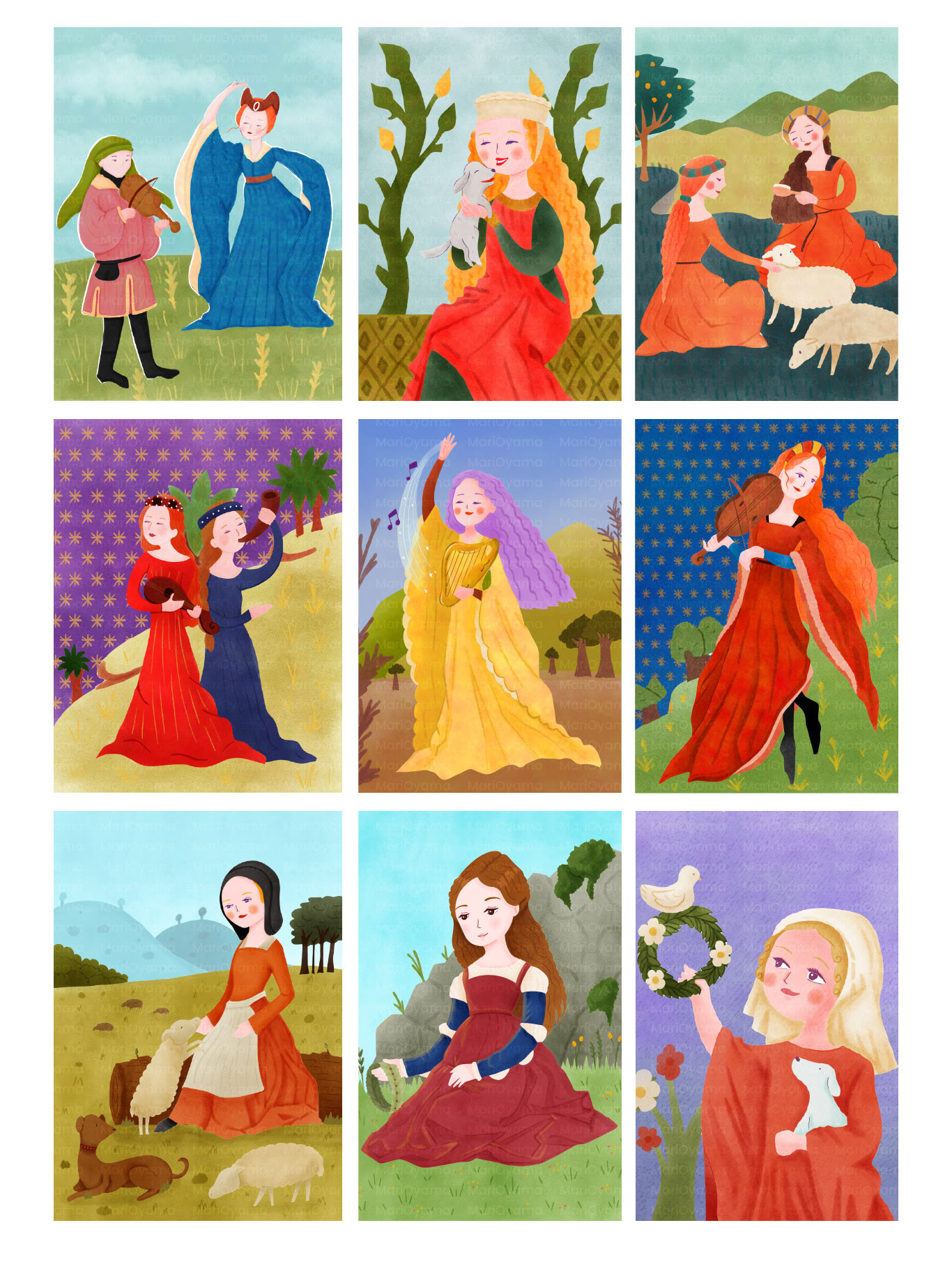 Hand-drawn illustrations created with Adobe Fresco, inspired by medieval art and vintage fantasy illustrations.