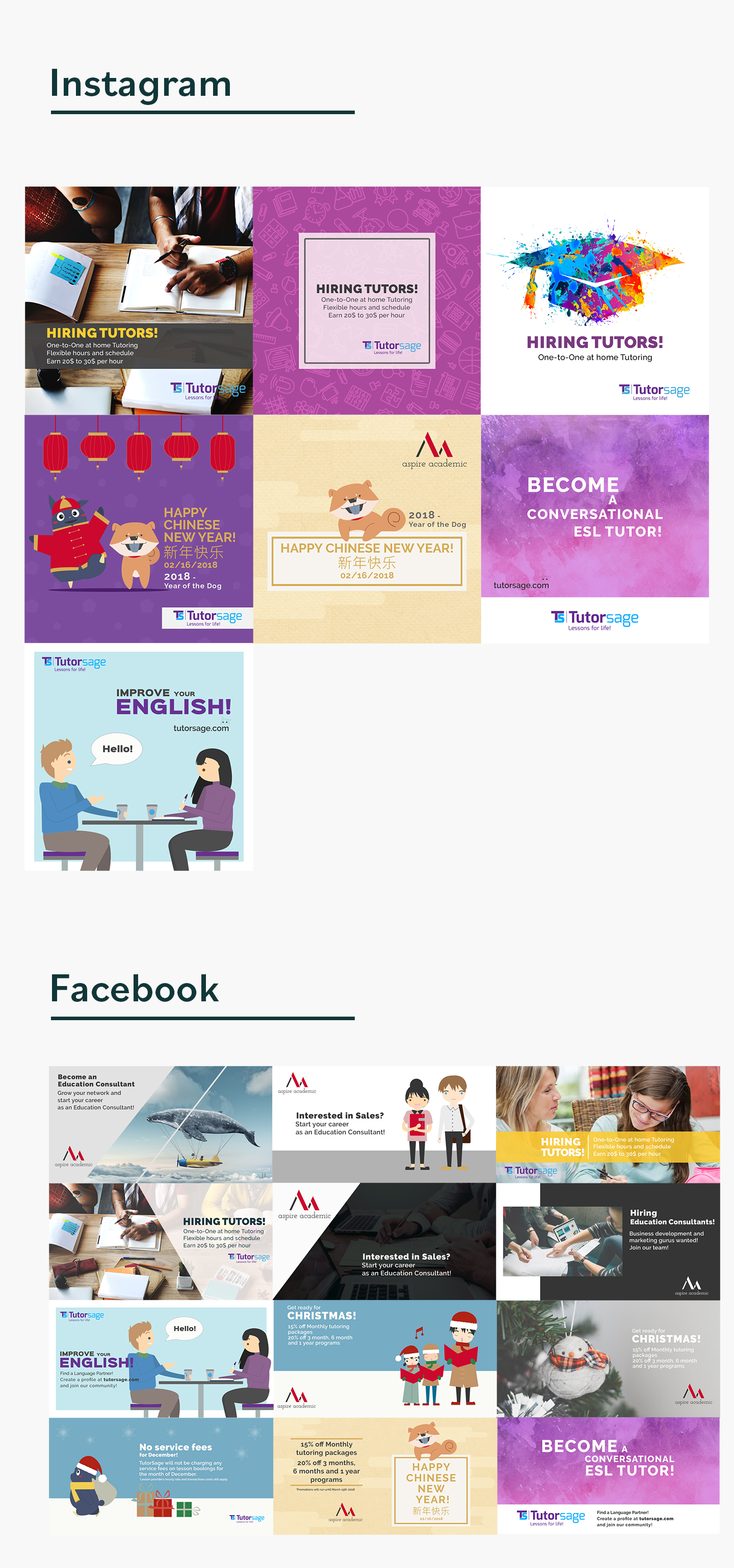 Collection of social media designs I worked on for Tutorsage Inc. and Aspire Academic. To compose the layouts, I used a mixture of stock photos and vector illustrations of my own creation.